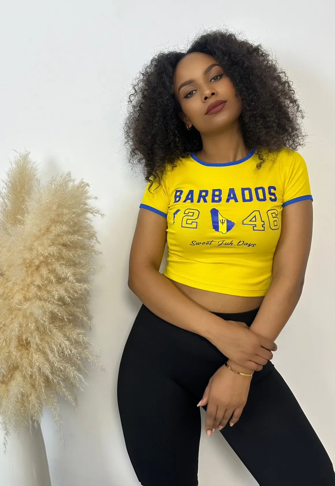 Show your love for the islands with this Barbados stretchy fitted tee, featuring a yellow body with blue sleeves and collars for a bold, striking look.