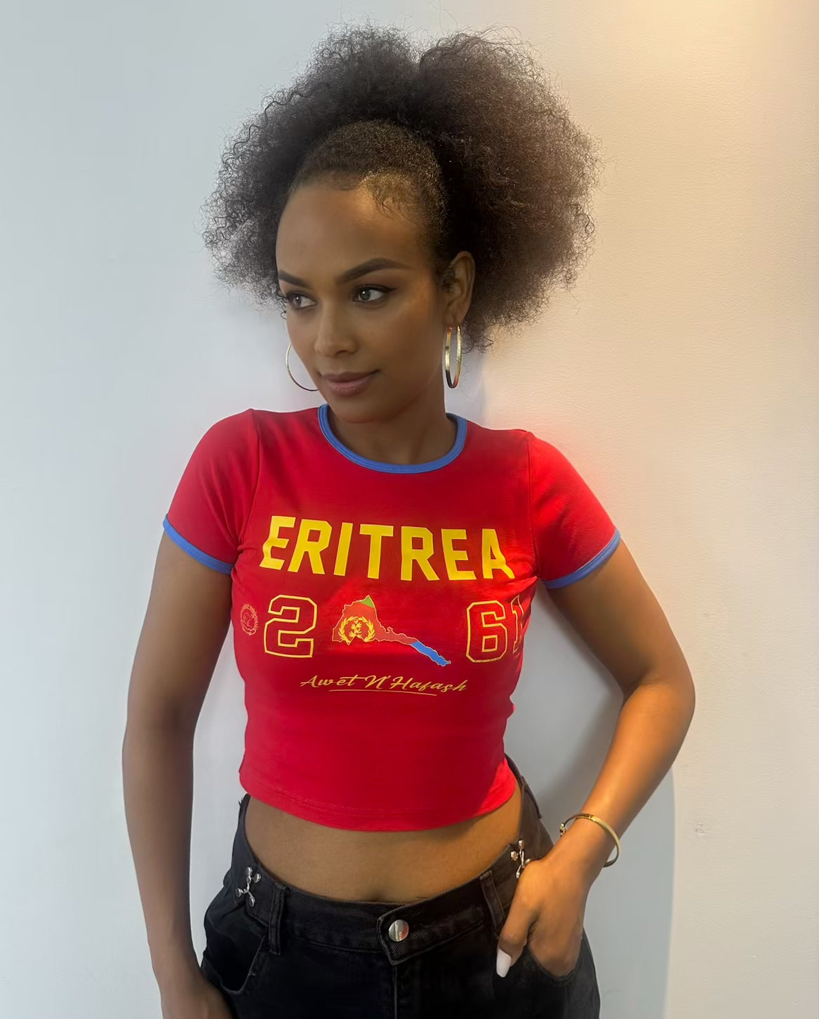 Show off your love for Eritrea with our stylish and stretchy fitted tee, featuring a red body with blue sleeves and collars.