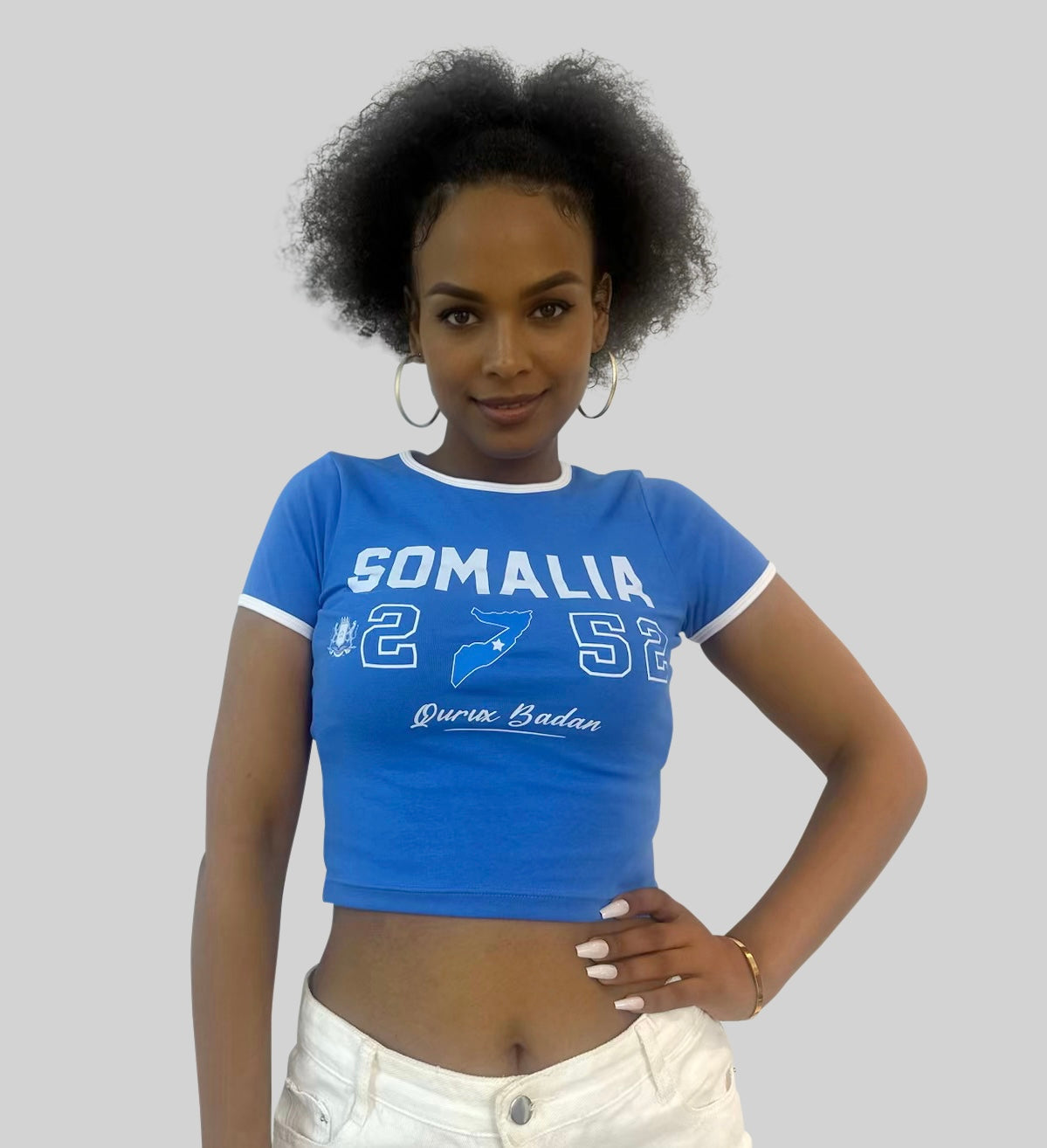 Show off your love for Somalia in style with our stretchy fitted tee, featuring a baby blue body with white sleeves and collars.