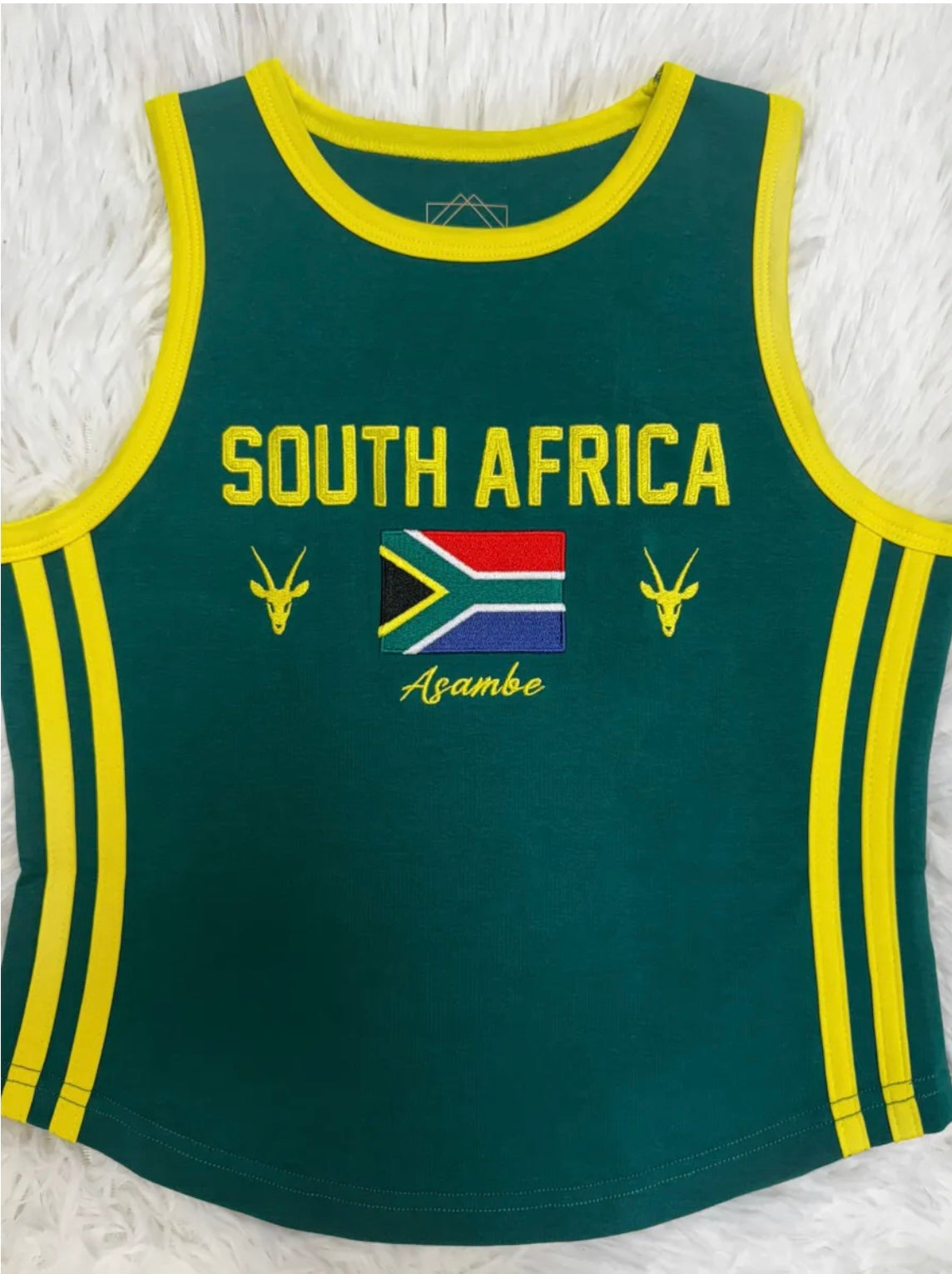ASAMBE! Embrace the spirit of South Africa in this sleeveless tank top, featuring bold, detailed embroidery of the flag. Perfect for festivals, sunny days, and showing off your heritage in style.