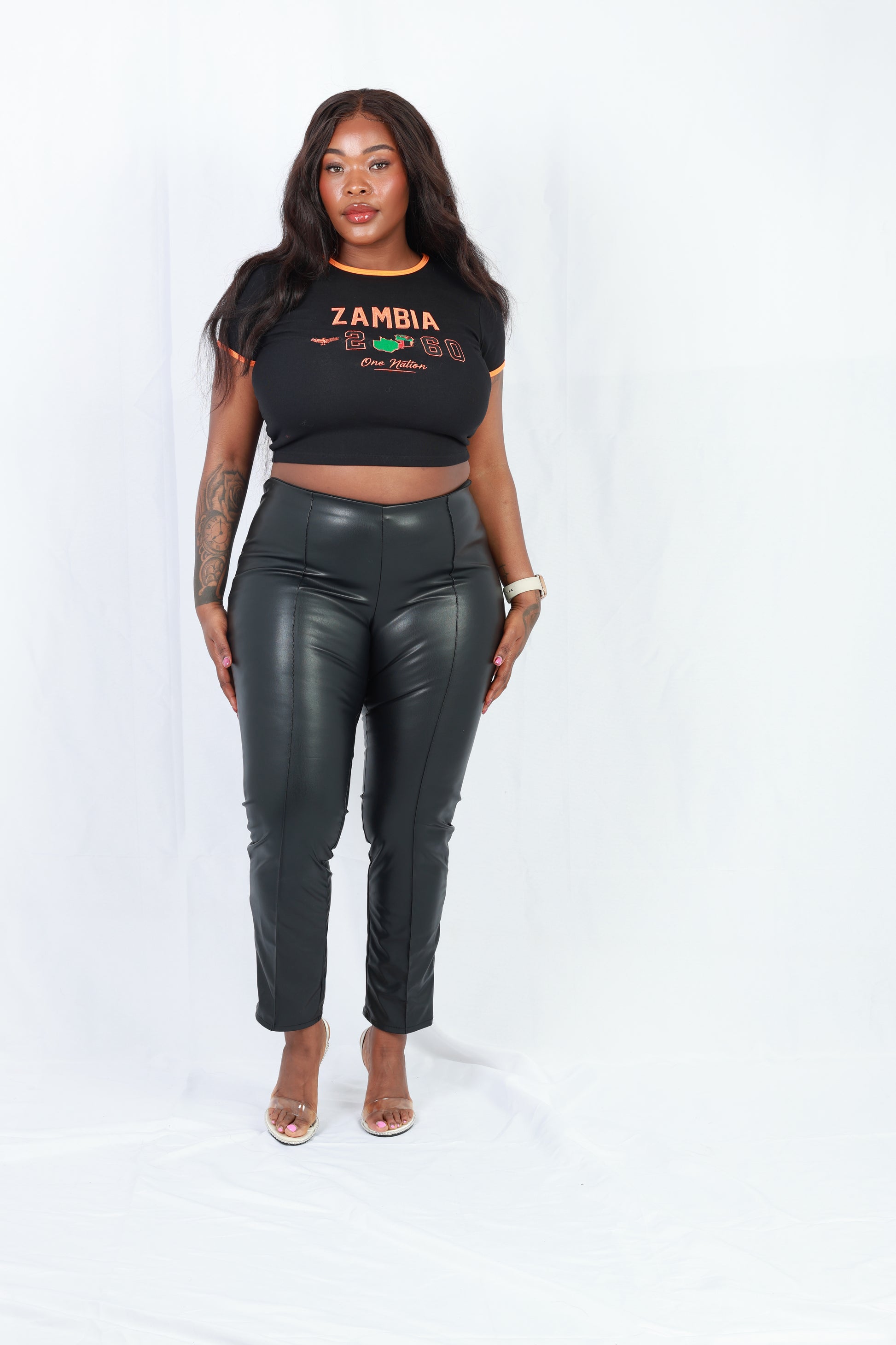 Represent Zambia in style with our stretchy fitted tee, featuring a black body with striking orange sleeves and collar.